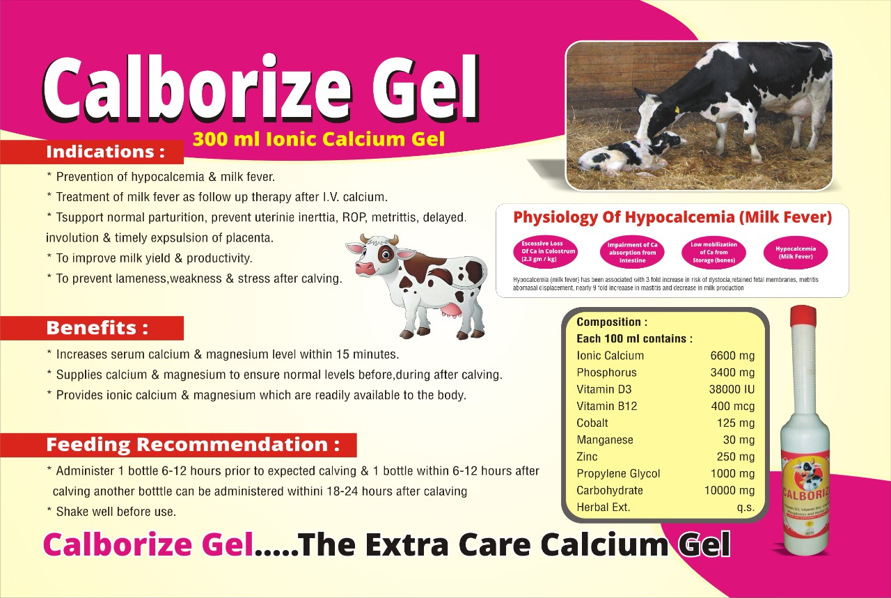 Calcium Gel could be a organic process supply of Ca accustomed facilitate maintain traditional Ca levels in cows throughout the essential pre-calving and immediate post-calving amount. Ca Gel is a straightforward to use non-irritating supply of Ca in an exceedingly bland oil gel.